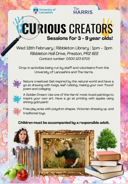 The Harris and the University of Lancashire are looking for 2 Harris Volunteers to assist with running some family-friendly activities during half term at Ribbleton Library. You'll be working alongside a mixture of Harris and University staff to help support and deliver some creative activities over a 2 hour drop-in session.